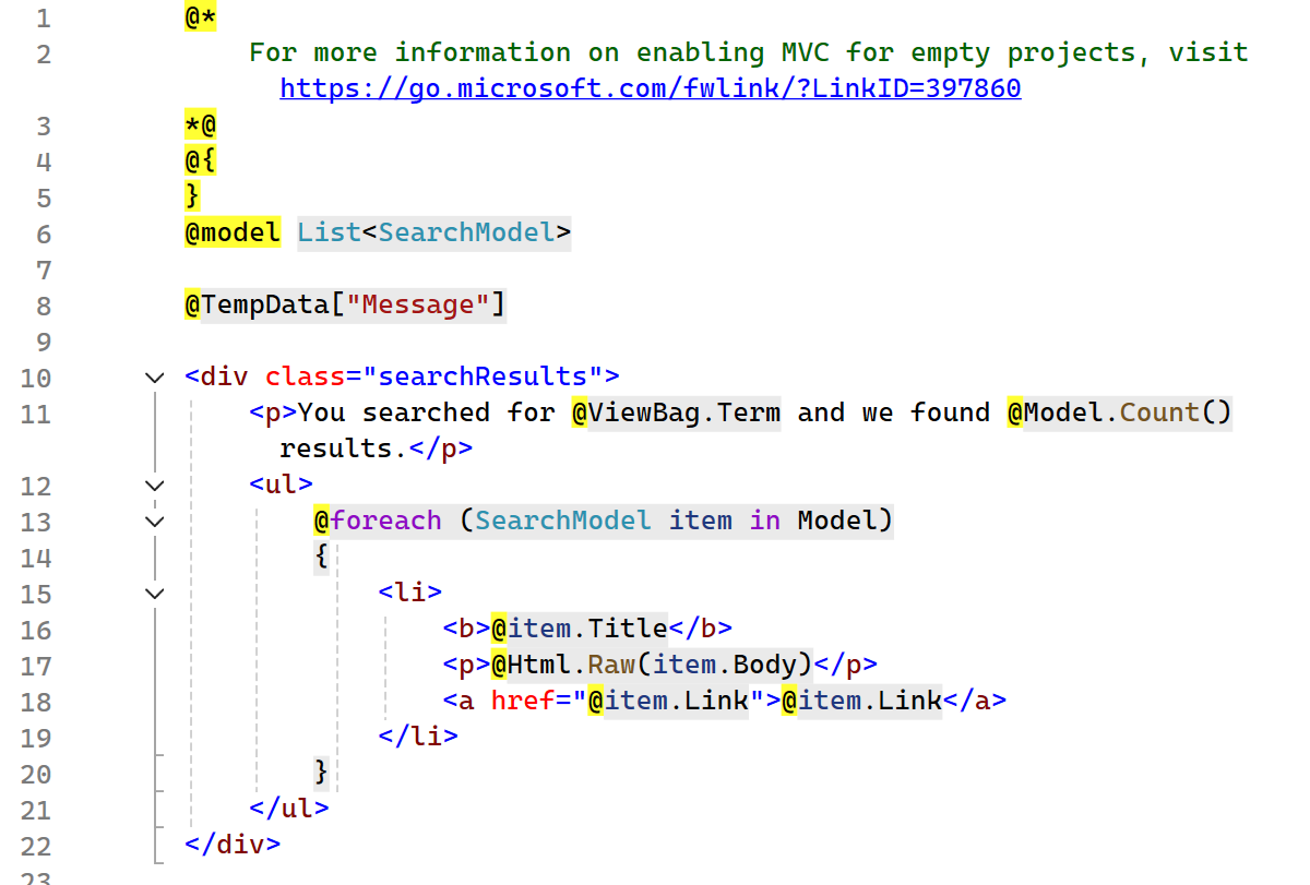 On line 48, the results variable is declared, which holds a query by field search in Solr. A model variable is declared as a list for SearchModel, which defines the model for the frontend (view). An iteration statement is started on line 51, using a foreach loop. On line 53, a highlights variable is declared which stores the ID of the Solr document to be accessed in the loop. Using Linq, a ForEach loop is nested inside the root loop to iterate over the values returned by the highlighter. Data inside the loop on line 4 needs to be iterated over again, to customize the data sent to the model, as on line 58. The next screenshot shows the corresponding CSHTML to render the results.